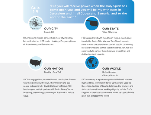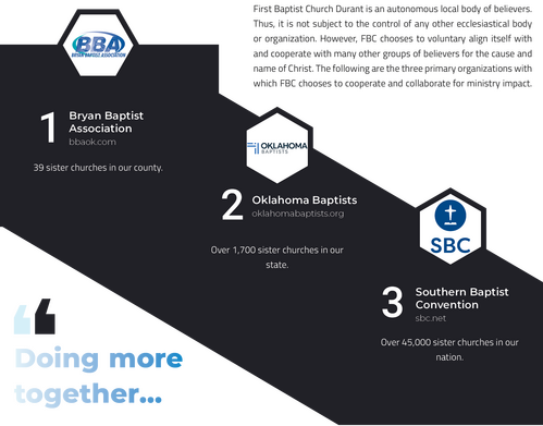The Cooperative Program (CP) was created in 1925 by the SBC to help churches cooperate together so that every person on the planet could have the opportunity to become a Christian. FBC supports the CP, which supports Baptist seminaries, Ethics and Religious Liberty Commission, church planting and evangelism efforts by the North American Mission Board and the International Mission Board, and more. FBC is committed to generously supporting the CP and other missions endeavors.